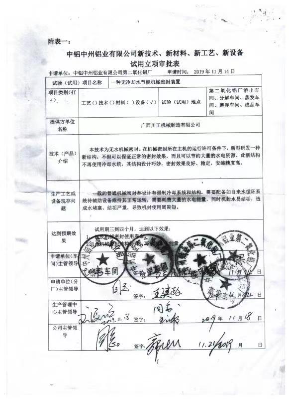 白銀一種機械密封試驗裝置-專利證書